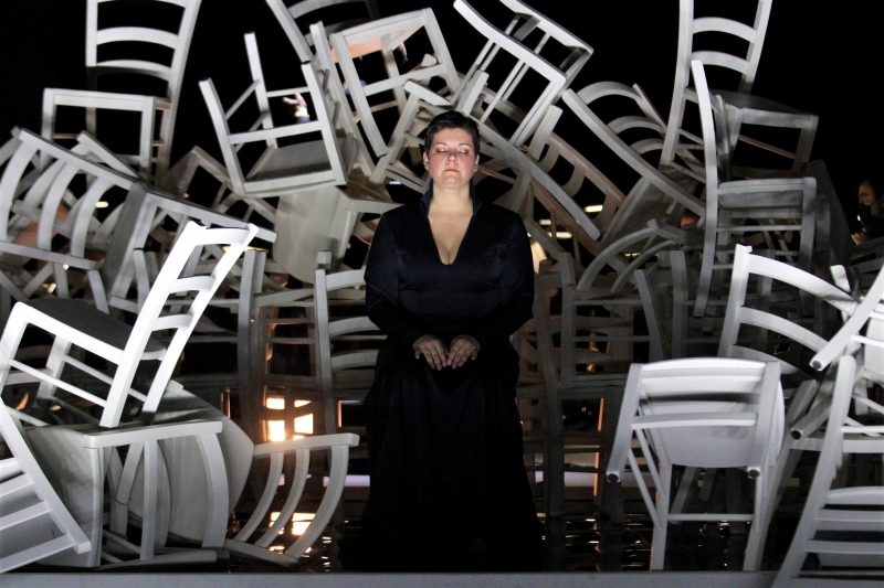 Prema riječima redatelja Marina Blaževića, riječka Traviata nije prilagođena protupandemijskim mjerama nego su te mjere i njihove posljedice na društveni život i pojedinačne sudbine postale temom inscenacije (originalna Violetta inače boluje od tuberkuloze). Ogleda se to u smještaju triju glavnih likova u niše odijeljene pleksiglasom (Violetta između Germonta oca i sina) tako da je fizički kontakt među njima sveden na minimum. Moram priznati da mi je ovakvo polukoncertno izvođenje Traviate, sa zanimljivom interakcijom Violette i Alfreda u I. činu (uključujući i crtanje cvijeta crvenim ružem), zbog pandemijskoga konteksta u početku djelovalo legitimnim. Onomu koji poznaje sadržaj opere, sofe i lusteri u salonu nisu nužno potrebni. Da je cijela inscenacija ostala na tragu pretežne nenametljivosti I. čina, ne bi smetala. No povremeno koreografiranje pjevačkih fraza i motiva znalo je biti iritantno, a ono što se nije smjelo dogoditi jest da Alfredovo premještanje stolica u duetu Violette i Germonta u II. činu, tijekom kojega se on uopće ne bi trebao pojavljivati, krade pažnju i koncentraciju publike koja bi trebala biti primarno usredotočena na Verdijevu glazbu. Svaka nota i svaka fraza toga dueta na svojem su mjestu i nikako ne priliči onemogućivati gledatelja u pažljivu osluškivanju tog nezaboravnog broja radi nepotrebne redateljske invencije. Kad su stolice u III. činu samo nepomično stajale na hrpi (instalacija Guida Venturinija), mogle su se tolerirati. Stilizirana klasika kostima Sandre Dekanić bila je primjerena.