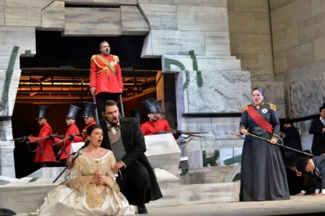 Argumenti muzikološke rasprave ne moraju se smatrati obvezujućima za redateljevu imaginaciju. Del Monacova estetika statičnih živih slika legitimno je zamišljena, ali je mogu iznijeti samo solisti koji su ne samo dobri glumci nego i prave scenske ličnosti i koji besprijekorno pjevaju. U takvim slikama dotjerani kostimi iz 19. stoljeća, solistički i zborski, i monumentalna scenografija, inspirirana djelomično arhitekturom iz originalnog vremena radnje, oboje djelo Williama Orlandija, stvaraju vrlo povoljan estetski dojam.